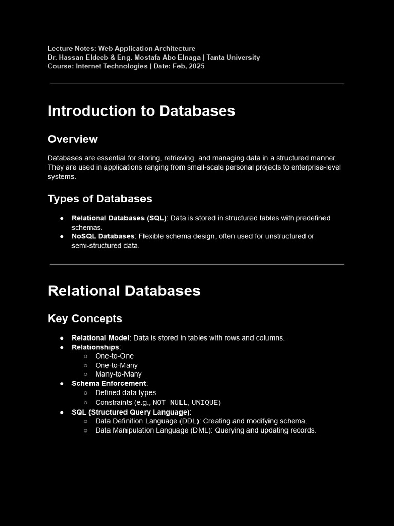 ● Relational Databases (SQL): Data is stored in structured tables with predefined