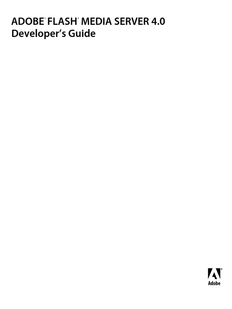 Adobe Flash Media Server 4 Developers Guide This guide is licensed for use under the terms of the Creative Commons Attribution Non-Commercial 3.0 License. This License allows users to copy, distribute, and transmit the user guide for noncommercial purposes only so long as (1) proper attribution to Adobe is given as the owner of the guide; and (2) any reuse or distribution of the user guide contains a notice that use of the guide is governed by these terms. The best way to provide notice is to include the following link. To view a copy of this license, visit http://creativecommons.org/licenses/by-nc/3.0/us/ Adobe, the Adobe logo, Adobe AIR, Adobe Premiere, ActionScript, Acrobat Connect, AIR, Creative Suite, Dreamweaver, Flash, Flash Builder, Flash Lite, Flex, Flex Builder, and XMP are either registered trademarks or trademarks of Adobe Systems Incorporated in the United States and/or other countries. Java is a trademark or registered trademark of Sun Microsystems, Inc. in the United States and other countries. Microsoft and Windows are either registered trademarks or trademarks of Microsoft Corporation in the United States and/or other countries. Macintosh and Mac OS are trademarks of Apple Inc., registered in the United States and other countries. All other trademarks are the property of their respective owners. Linux is the registered trademark of Linus Torvalds in the U.S. and other countries. Adobe Systems Incorporated, 345 Park Avenue, San Jose, California 95110, USA.