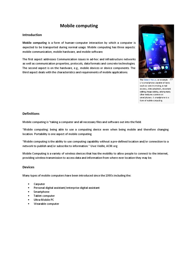Mobile computing is a form of humancomputer interaction by which a computer is expected to be transported during normal usage. Mobile computing has three aspects: mobile communication, mobile hardware, and mobile software. The first aspect addresses Communication issues in ad-hoc and infrastructure networks as well as communication properties, protocols, data formats and concrete technologies. The second aspect is on the hardware, e.g., mobile devices or device components. The third aspect deals with the characteristics and requirements of mobile applications.