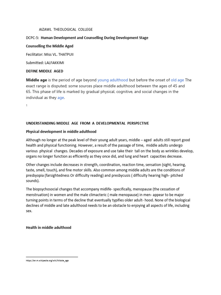 health and physical functioning. However, a result of the passage of time, middle adults undergo