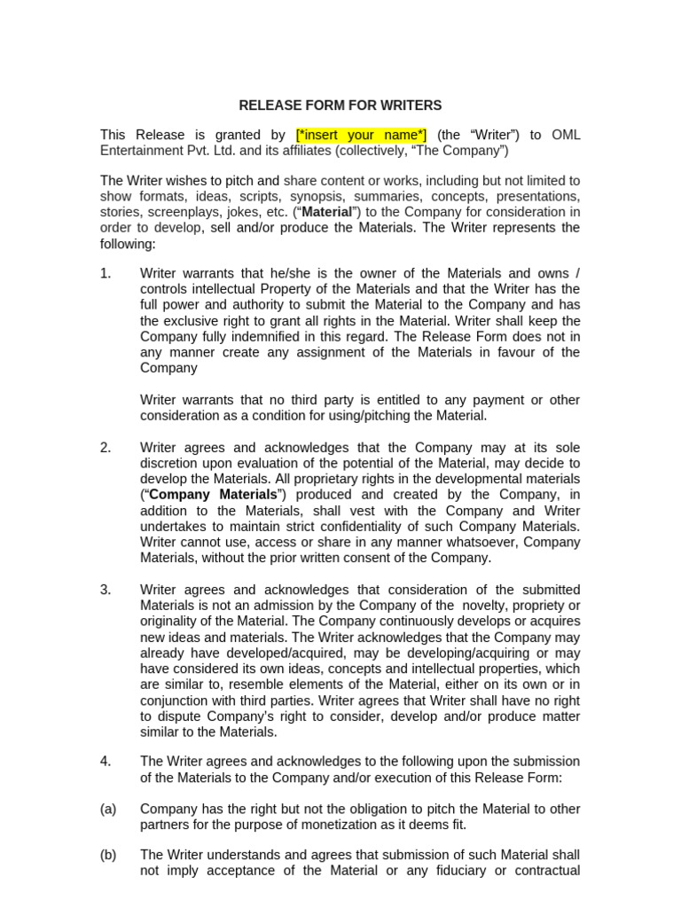 This Release is granted by [*insert your name*] (the “Writer”) to OML