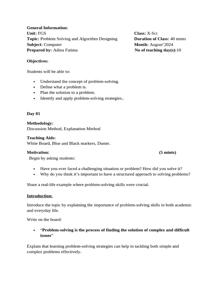 Topic: Problem Solving and Algorithm Designing Duration of Class: 40 mints