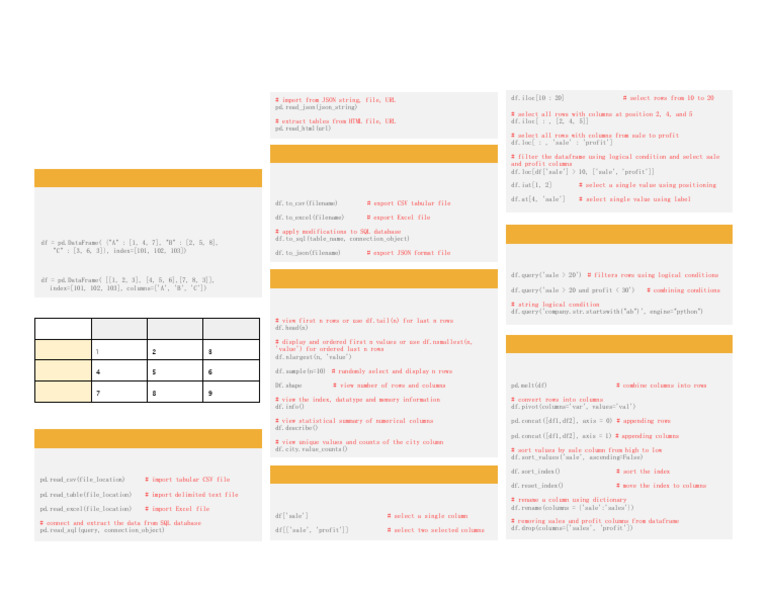 # import from JSON string, file, URL df.iloc[10 : 20] # select rows from 10 to 20
