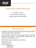 wafer diameter is currently 150mm, 200mm, 300mm wafer thickness <1mm surface is polished to optical smoothness Wafer is then ready for processing Each wafer will yield many chips chip die size varies from about 5mmx5mm to 15mmx15mm A whole wafer is processed at a time Different parts of each die will be made P-type or N-type (small amount of other atoms intentionally introduced - doping -implant) Interconnections are made with metal Insulation used is typically SiO2. SiN is also used. New materials being investigated (low-k dielectrics) nMOS Fabrication CMOS Fabrication p-well process n-well process twin-tub process All the devices on the wafer are made at the same time After the circuitry has been placed on the chip the chip is overglassed (with a passivation layer) to protect it only those areas which connect to the outside world will be left uncovered (the pads) The wafer finally passes to a test station test probes send test signal patterns to the chip and monitor the output of the chip The yield of a process is the percentage of die which pass this testing The wafer is then scribed and separated up into the individual chips. These are then packaged Chips are binned according to their performance