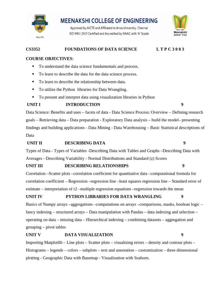 CS3352 FOUNDATIONS OF DATA SCIENCE LTPC3003