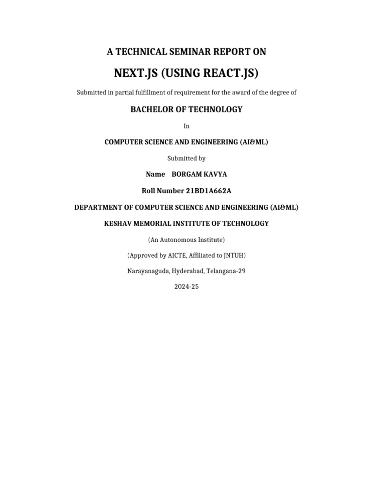 This is to certify that the seminar work entitled "NEXT.JS (USING REACT.JS)" is a