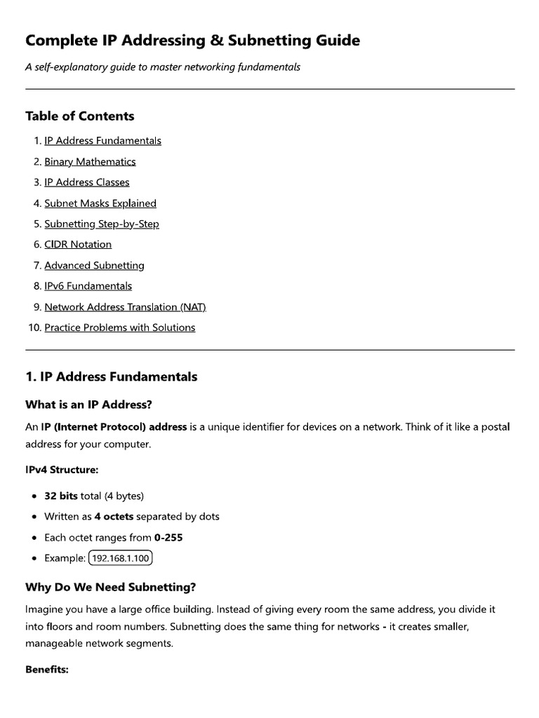 The document is a comprehensive guide on IP addressing and subnetting, covering topics such as IP address fundamentals, binary mathematics, subnet masks, CIDR notation, and IPv6. It explains the importance of subnetting for network organization, security, and efficient IP usage, along with practical examples and calculations for subnetting. Additionally, it includes sections on Network Address Translation (NAT) and practice problems with solutions to reinforce learning.