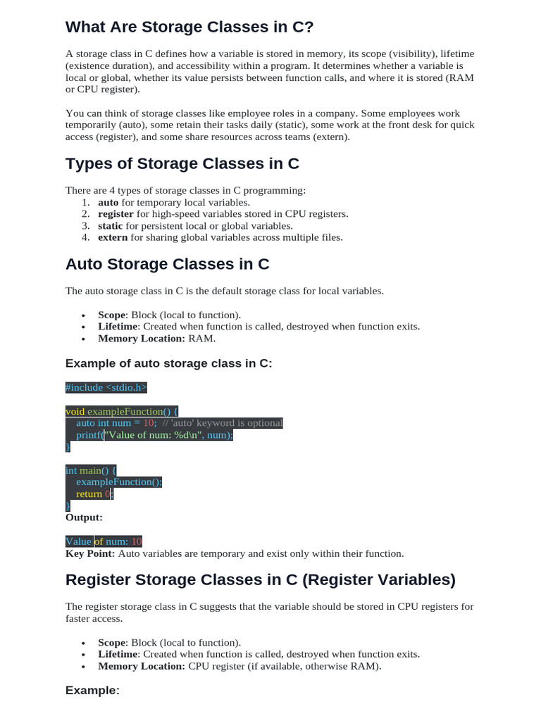 A storage class in C defines how a variable is stored in memory, its scope (visibility), lifetime