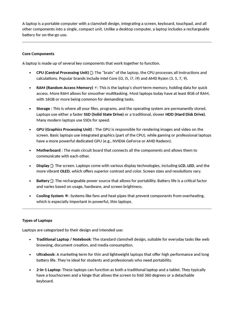 A laptop is a portable computer with a clamshell design, integrating a screen, keyboard, touchpad, and all