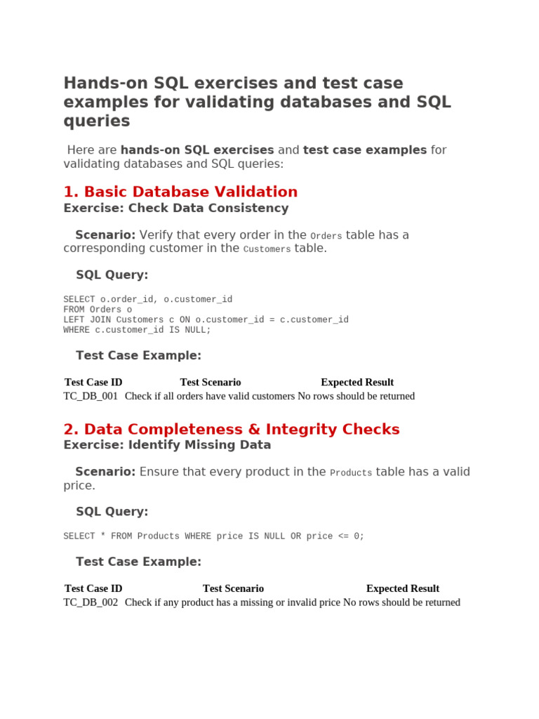 Here are hands-on SQL exercises and test case examples for