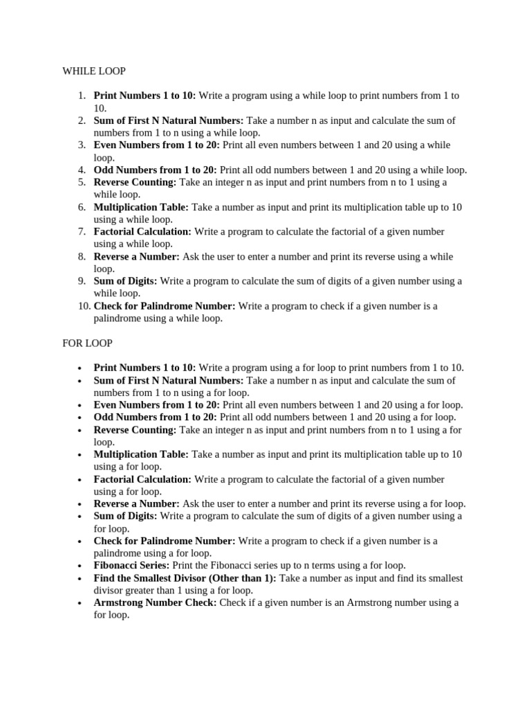 1. Print Numbers 1 to 10: Write a program using a while loop to print numbers from 1 to