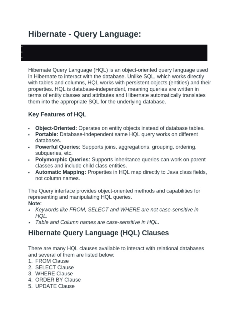 properties. HQL is database-independent, meaning queries are written in
