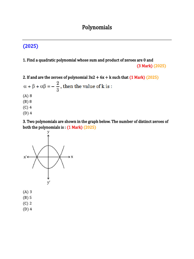 2. If and are the zeroes of polynomial 3x2 + 6x + k such that (1 Mark) (2025)