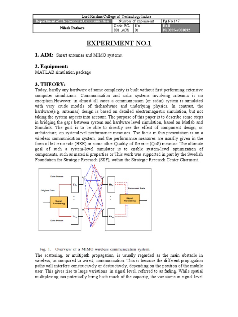 1. AIM: Smart antennas and MIMO systems. 2. Equipment: