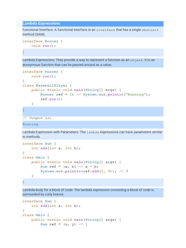 Lambda Expressions: They provide a way to represent a function as an object. It is an