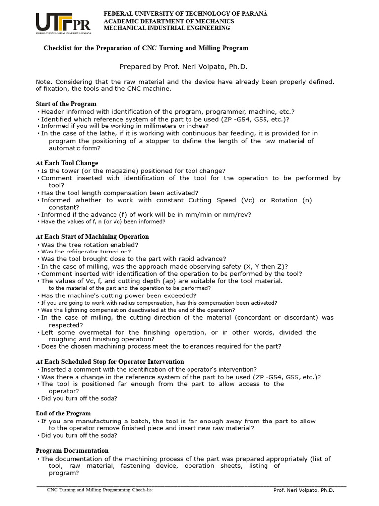 CNC Turning and Milling Programming Check-list Prof. Neri Volpato, Ph.D.