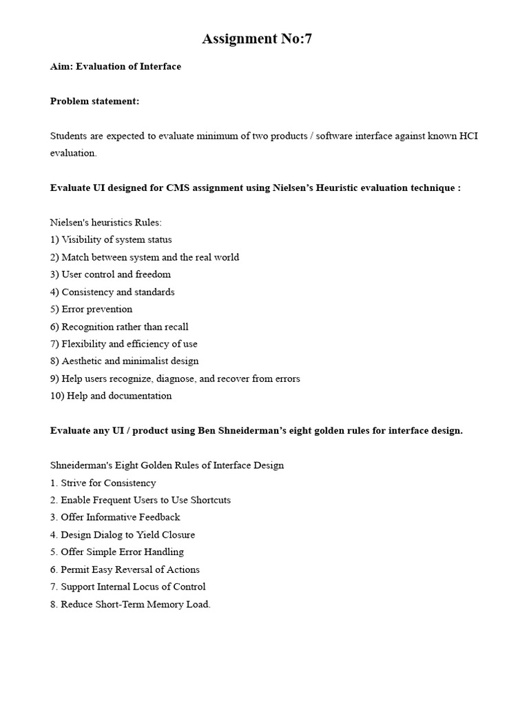 Evaluate UI designed for CMS assignment using Nielsen’s Heuristic evaluation technique :