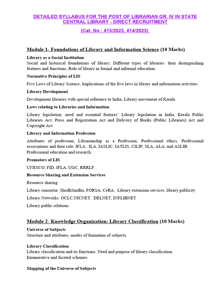 DETAILED SYLLABUS FOR THE POST OF LIBRARIAN GR.