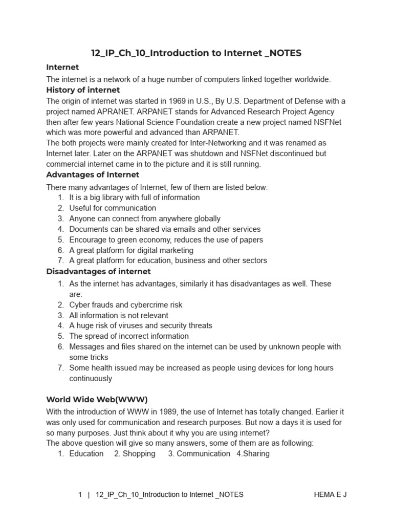 1 | 12_IP_Ch_10_Introduction to Internet _NOTES HEMA E J