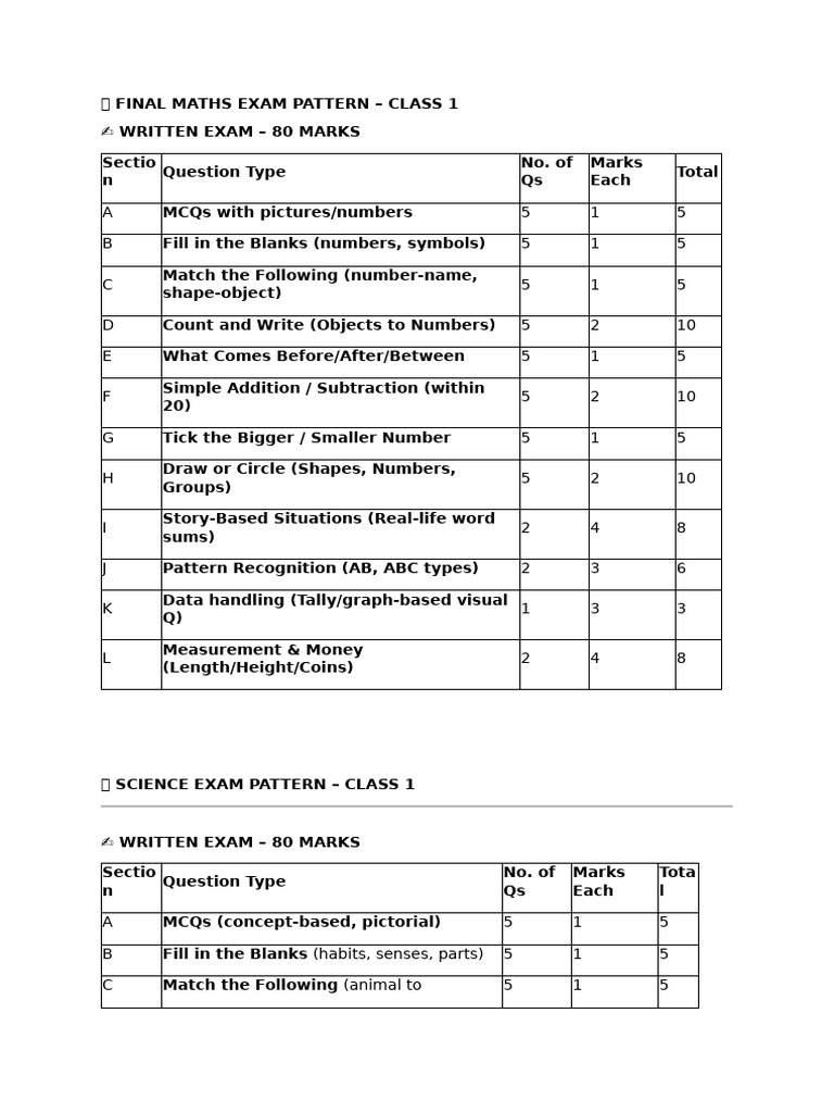 🔢 FINAL MATHS EXAM PATTERN – CLASS 1
