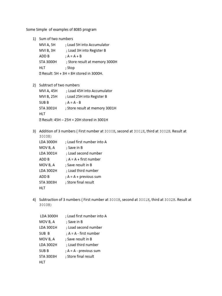 4) Subtraction of 3 numbers ( First number at 3000H, second at 3001H, third at 3002H. Result at
