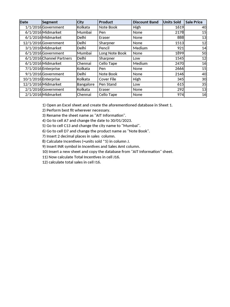 1) Open an Excel sheet and create the aforementioned database in Sheet 1.