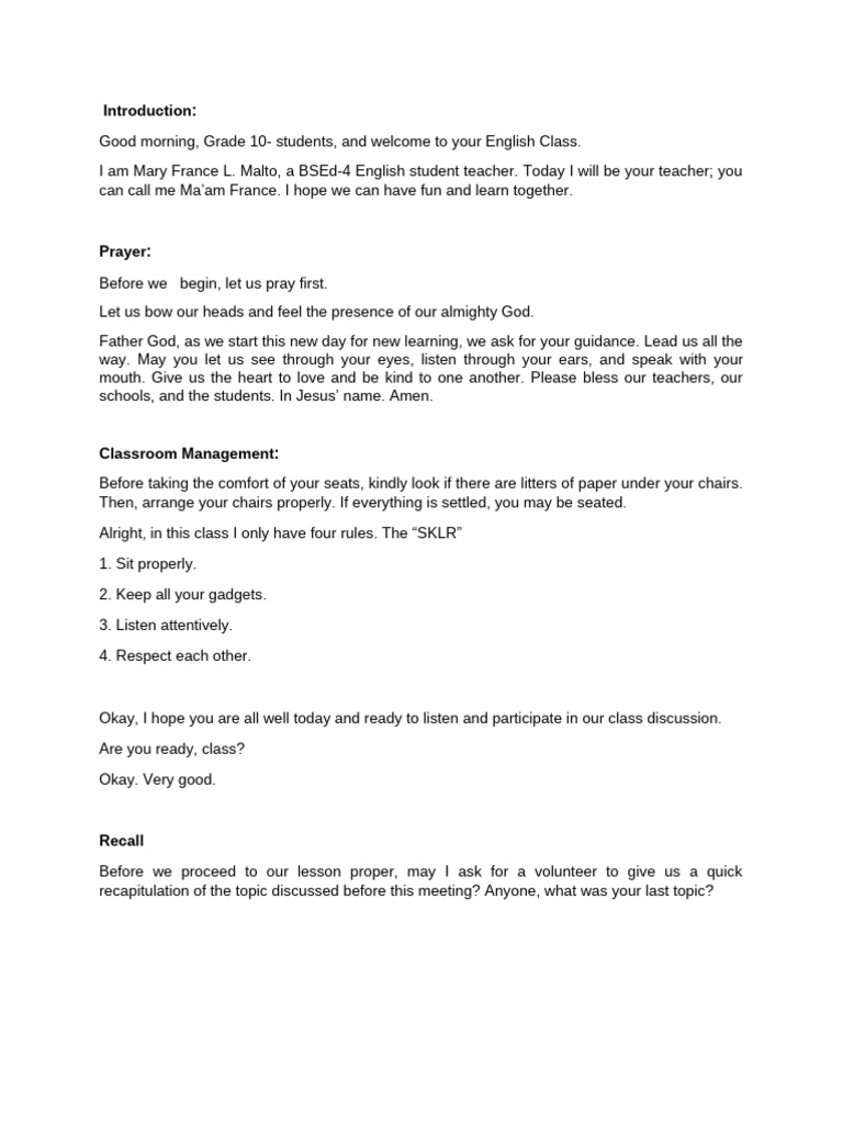 I am Mary France L. Malto, a BSEd-4 English student teacher. Today I will be your teacher; you