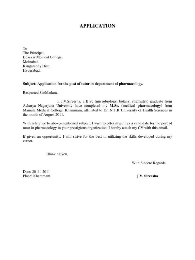 Subject: Application for the post of tutor in department of pharmacology. Respected Sir/Madam, I, J.V.Sireesha, a B.Sc (microbiology, botany, chemistry) graduate from Acharya Nagarjuna University have completed my M.Sc. (medical pharmacology) from Mamata Medical College, Khammam, affiliated to Dr. N.T.R University of Health Sciences in the month of August 2011. With reference to above-mentioned subject, I wish to offer myself as a candidate for the post of tutor in pharmacology in your prestigious organization. I hereby attach my CV with this email. If given an opportunity, I will strive for the best in utilizing the skills developed during my career.
