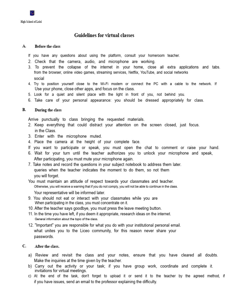 Internal Regulations of the Liceo de Lolol. In case of any violation or transgression of the rules