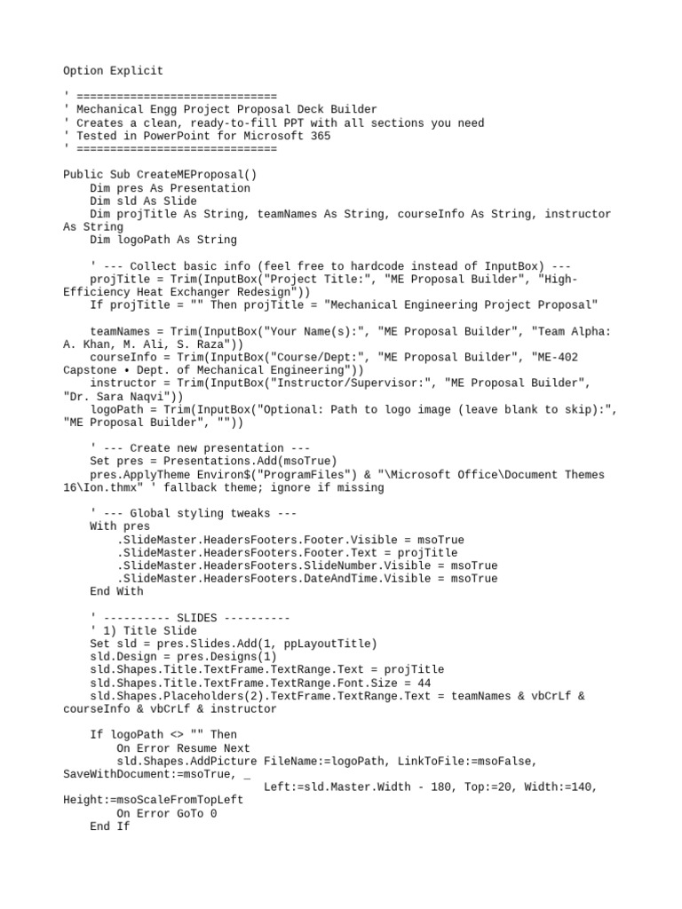 MsgBox "Your Mechanical Engineering Proposal deck is ready. Fill in content,