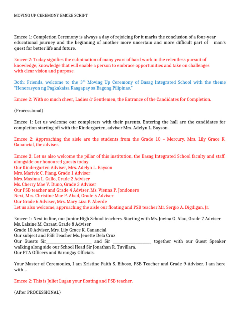 Both: Friends, welcome to the 3rd Moving Up Ceremony of Basag Integrated School with the theme
