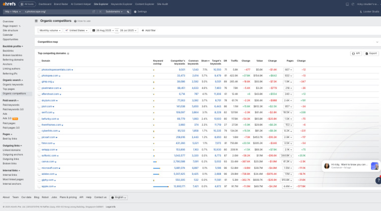 Referring domains Domain Keyword Competitor's Common Share Target's DR Traffic Change Value Change Pages Change