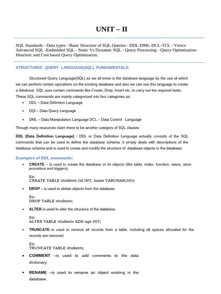 SQL Standards - Data types - Basic Structure of SQL Queries - DDL-DML-DCL-TCL - Views-