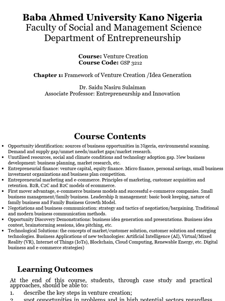 Chapter 1: Framework of Venture Creation /Idea Generation