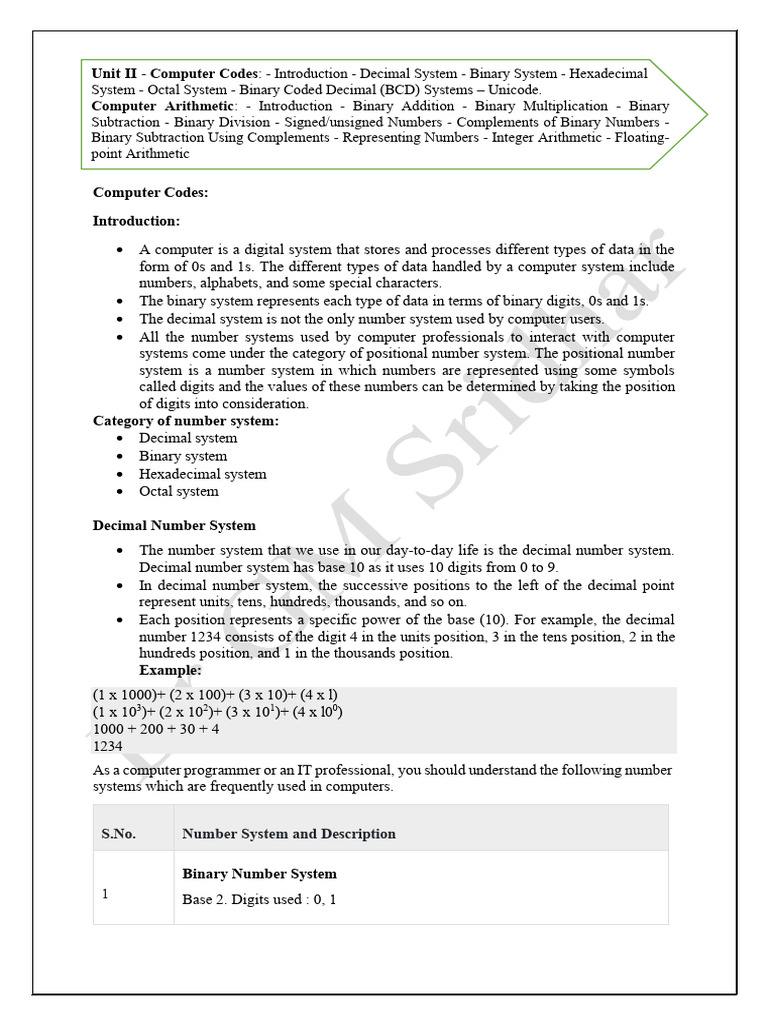 Unit II - Computer Codes: - Introduction - Decimal System - Binary System - Hexadecimal