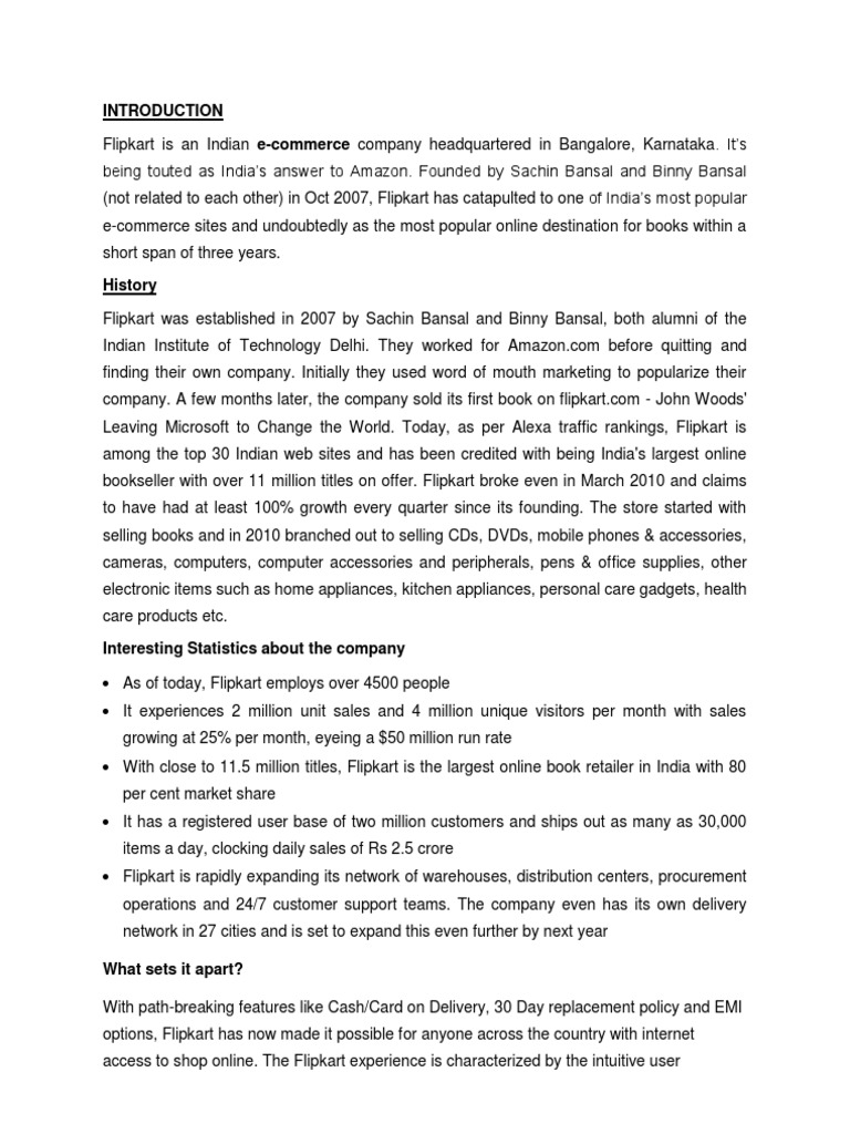 INTRODUCTION Flipkart is an Indian e-commerce company headquartered in Bangalore, Karnataka. Its being touted as Indias answer to Amazon.