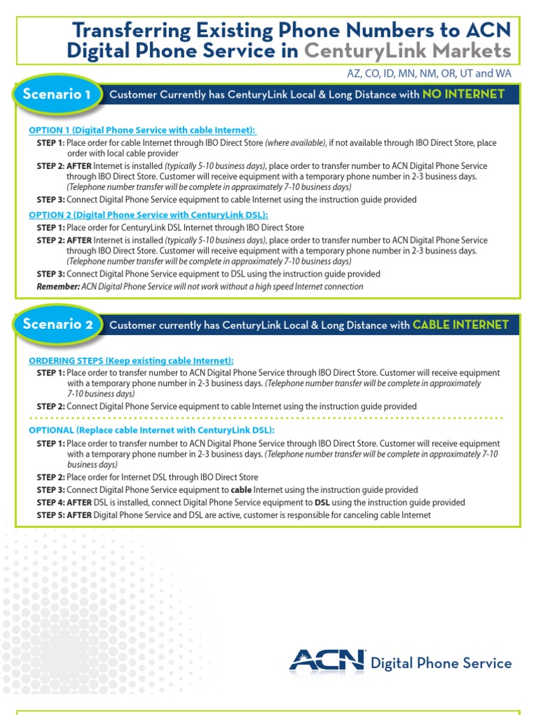 STEP 1: Place order to transfer number to ACN Digital Phone Service through IBO Direct Store. Customer will receive equipment with a temporary phone number in 2-3 business days. (Telephone number transfer will be complete in approximately 7-10 business days) STEP 2: Place order for cable Internet through IBO Direct Store (where available), if not available through IBO Direct Store, place order with local cable provider STEP 3: Connect Digital Phone Service equipment to DSL Internet using the instruction guide provided STEP 4: AFTER cable Internet is installed (typically 7-10 business days), connect Digital Phone Service equipment to cable Internet using the instruction guide provided STEP 5: AFTER Digital Phone Service and cable Internet are active, the customer is responsible for canceling CenturyLink DSL Internet