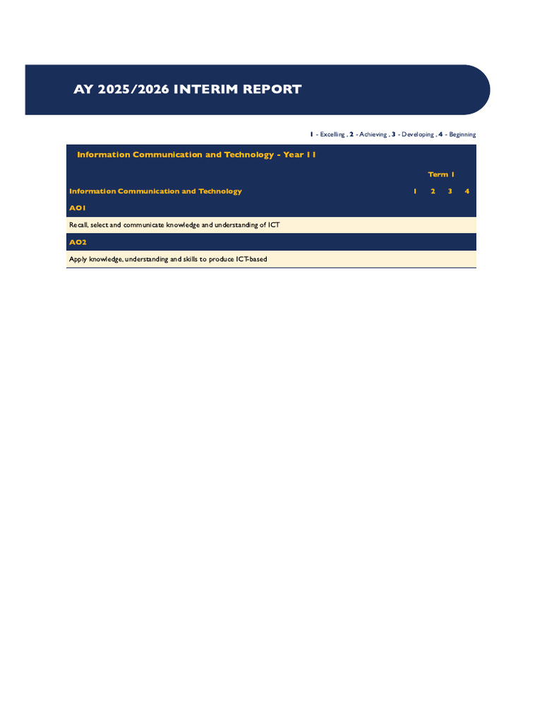 1 - Excelling , 2 - Achieving , 3 - Developing , 4 - Beginning