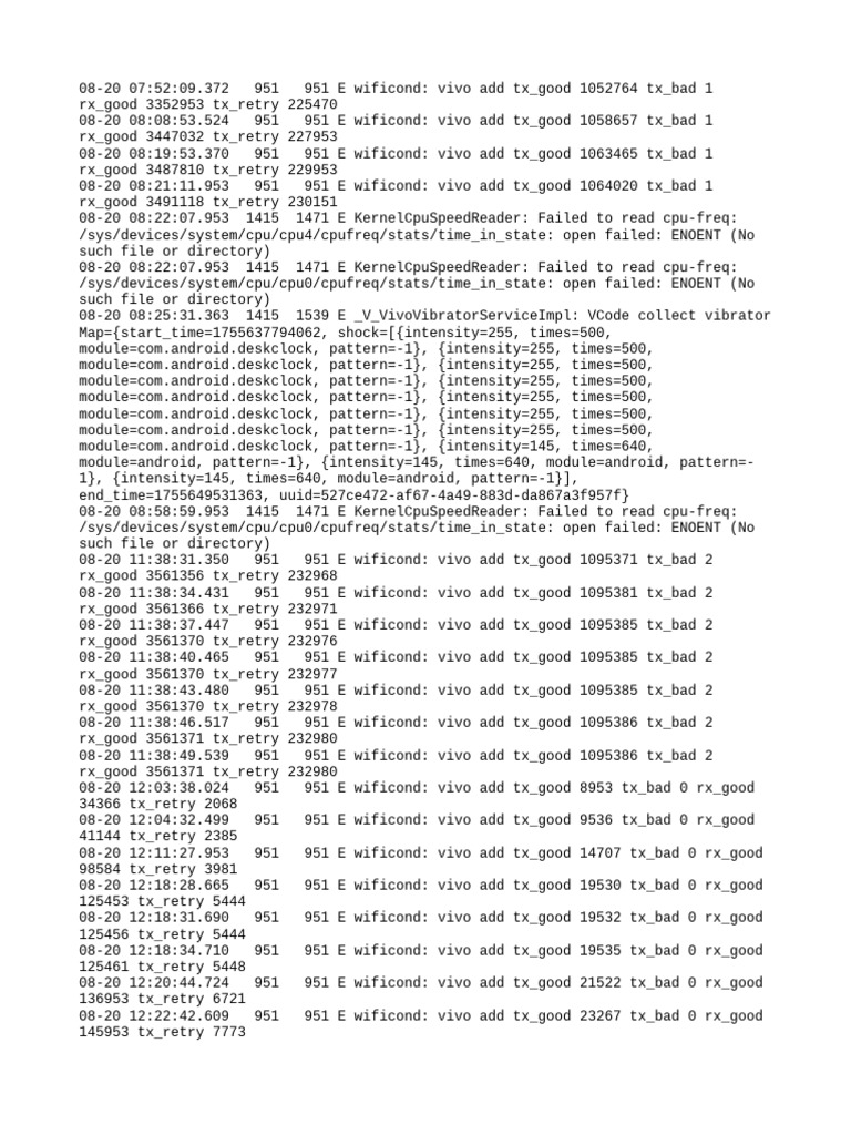 08-20 11:38:43.480 951 951 E wificond: vivo add tx_good 1095385 tx_bad 2