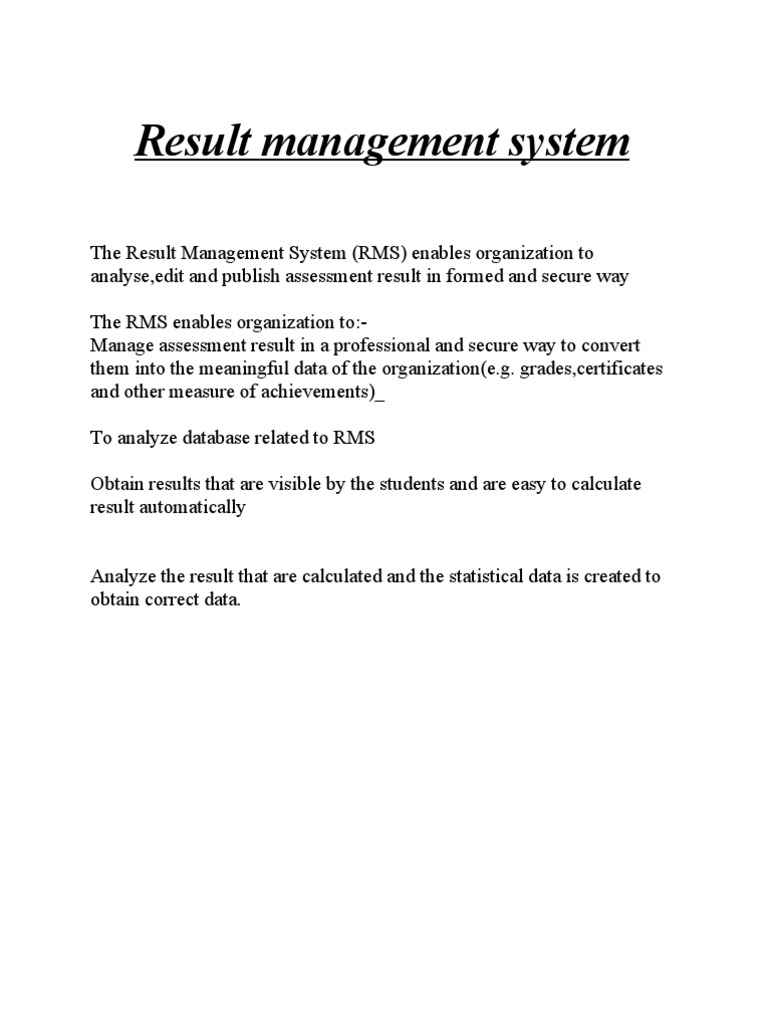 The Result Management System (RMS) enables organization to analyse,edit and publish assessment result in formed and secure way The RMS enables organization to:Manage assessment result in a professional and secure way to convert them into the meaningful data of the organization(e.g. grades,certificates and other measure of achievements)_ To analyze database related to RMS Obtain results that are visible by the students and are easy to calculate result automatically Analyze the result that are calculated and the statistical data is created to obtain correct data.