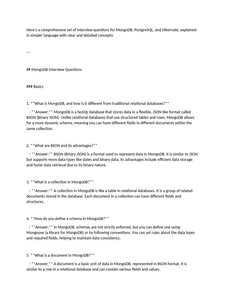 Here’s a comprehensive set of interview questions for MongoDB, PostgreSQL, and Hibernate, explained