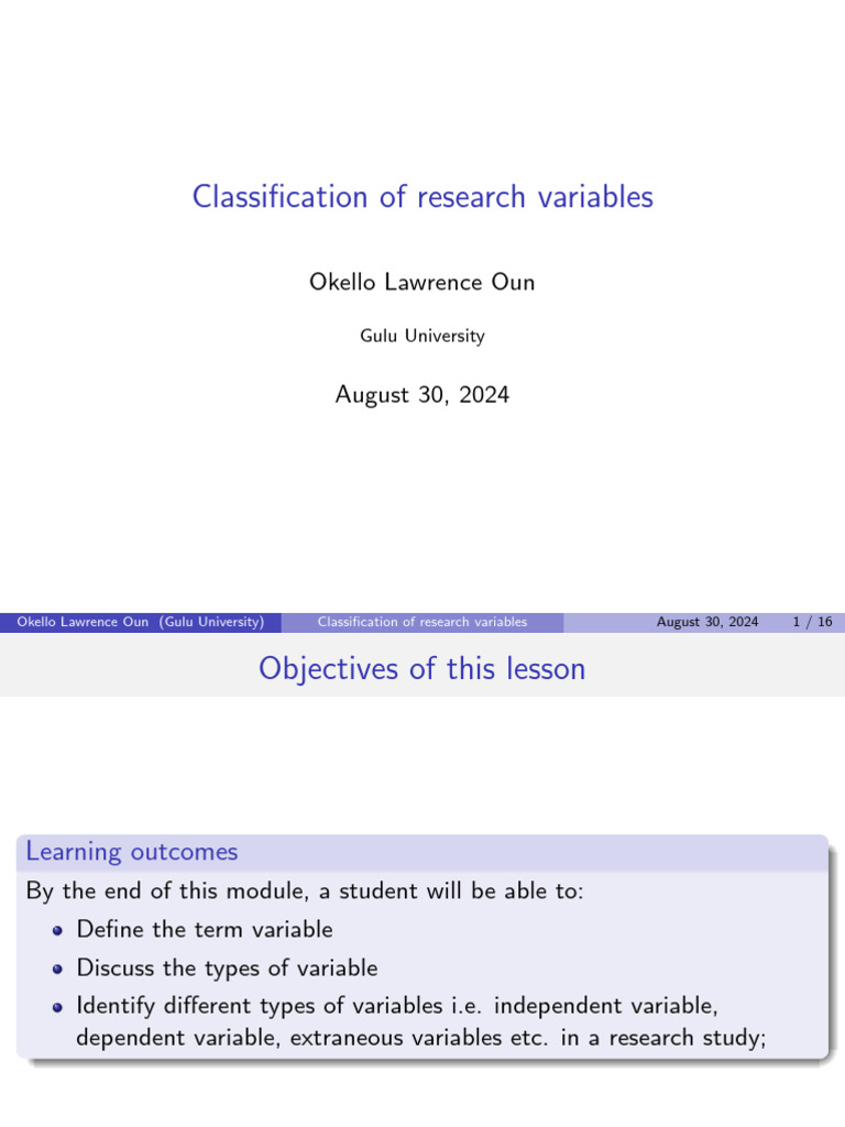 Okello Lawrence Oun (Gulu University) Classification of research variables August 30, 2024 2 / 16