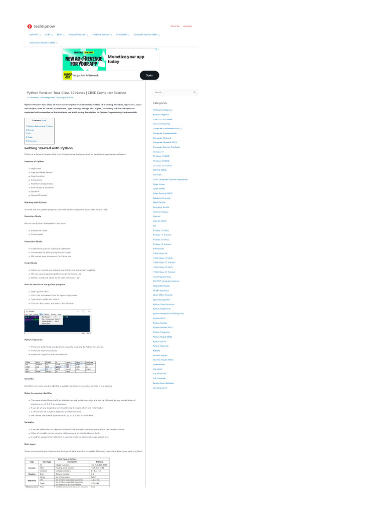Python Revision Tour Class 12 Notes covers Python Fundamentals of class 11 including Variables, Operators, Input