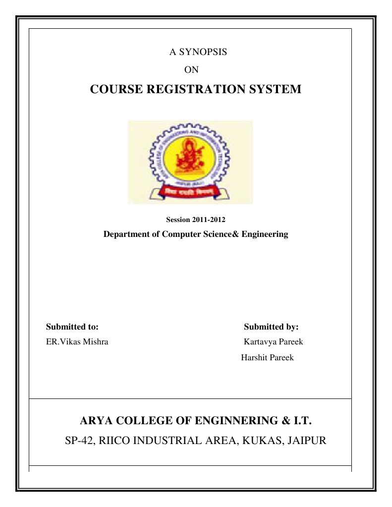 Course online registration contain the specific courses offered by the any institute .It should provide the proper detail about the course qualification, its syllabus ,the company which is offering it, the scope of the course after completing it. In this project we considering the courses offered for engineering student .The courses that are offered by the college in the 1st Year,2nd Year,3rd Year and 4th Year in all branches are taken in to consideration. The Student who wants to have any such courses can take help with my project to take all the details about the course he/she want to take. In this project a total interface is provided so that the student can register himself/herself on any course in the college so it provide a better way to get registered. It not only show details about your course that you have entered but also give details about the other courses that can be beneficial for the student. it also give the feedback of the teachers about the course and the feedback of the previous year students .