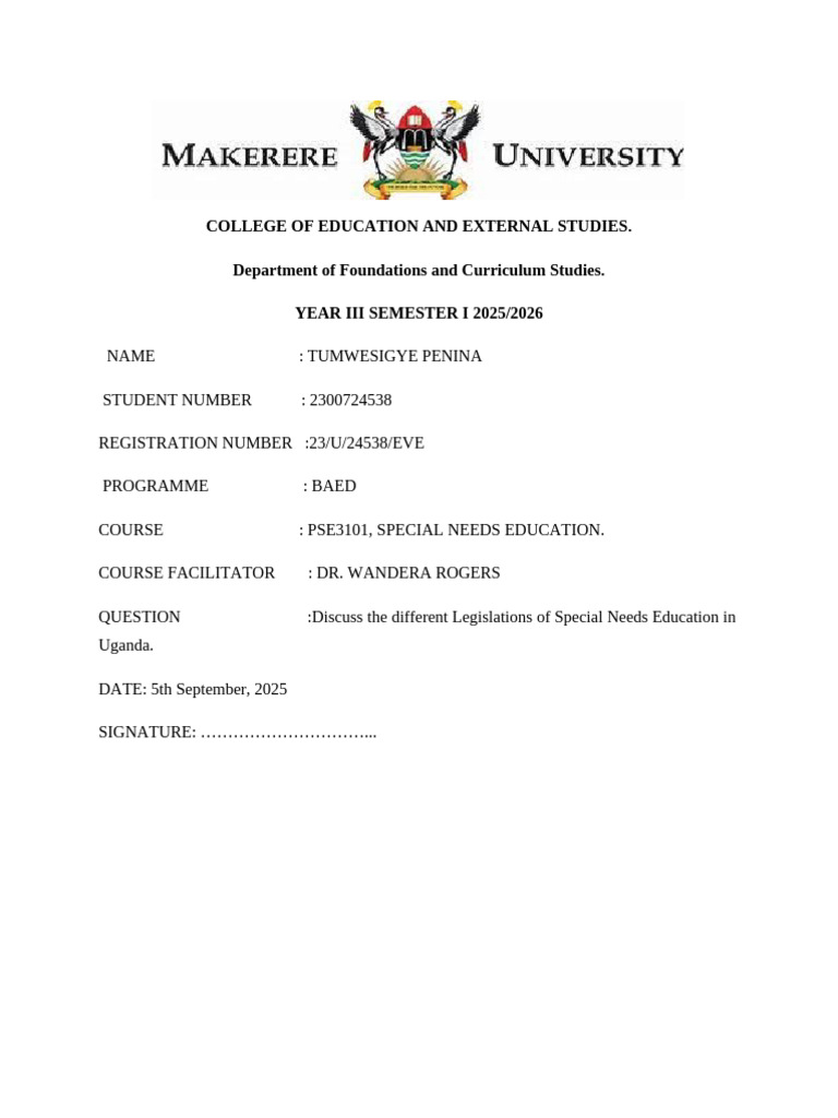 students. Special needs education in Uganda is primarily governed by a framework of legislation