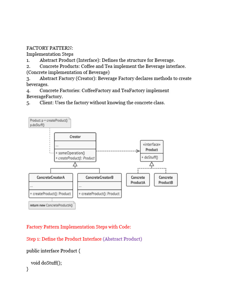 1. Abstract Product (Interface): Defines the structure for Beverage.