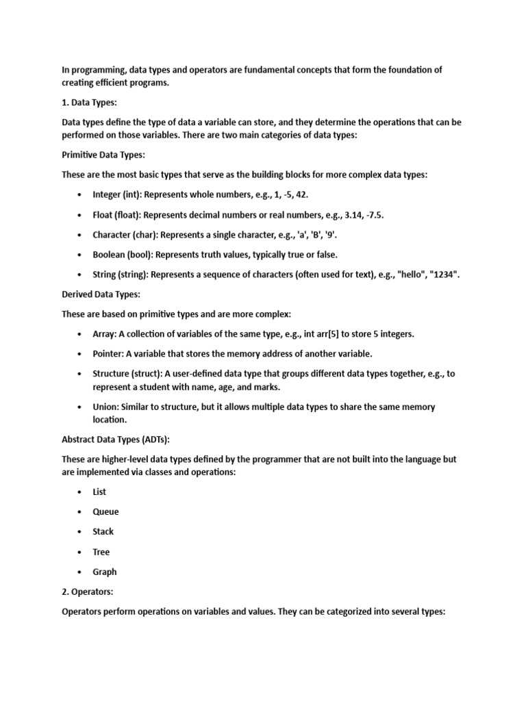 These are the core concepts related to data types and operators in programming. Let me know if you'd