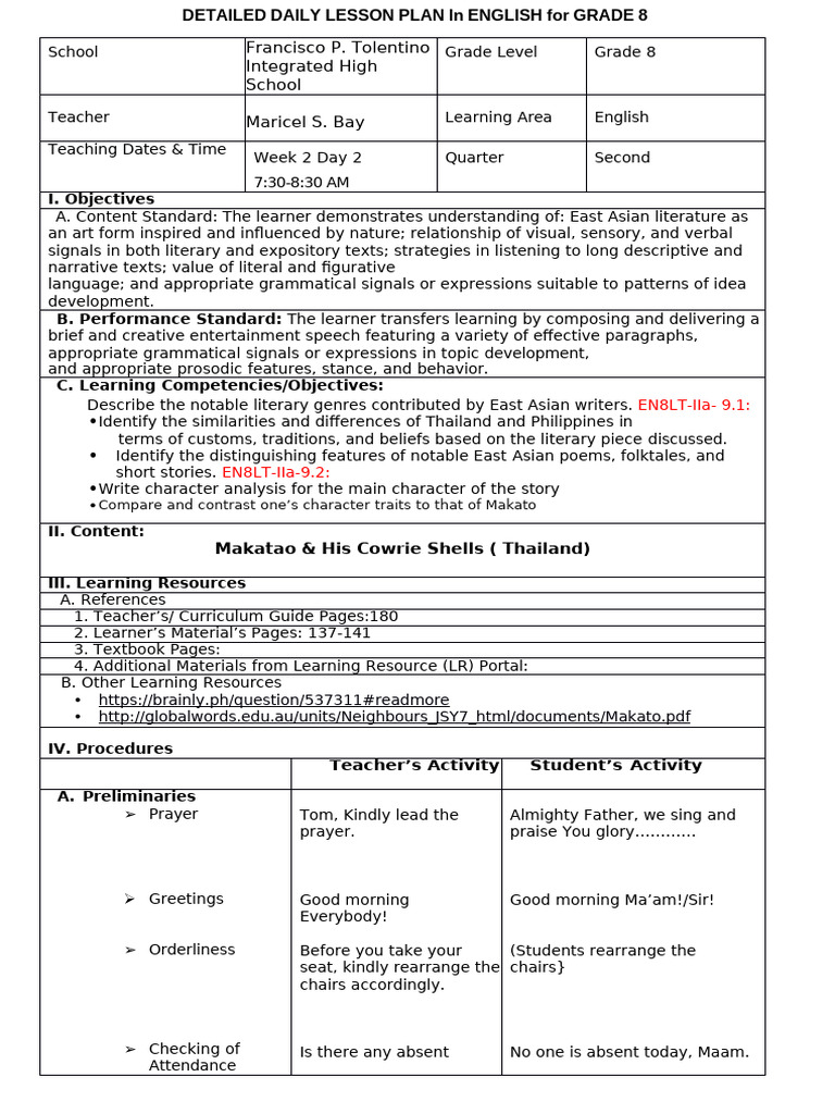 DETAILED DAILY LESSON PLAN In ENGLISH for GRADE 8