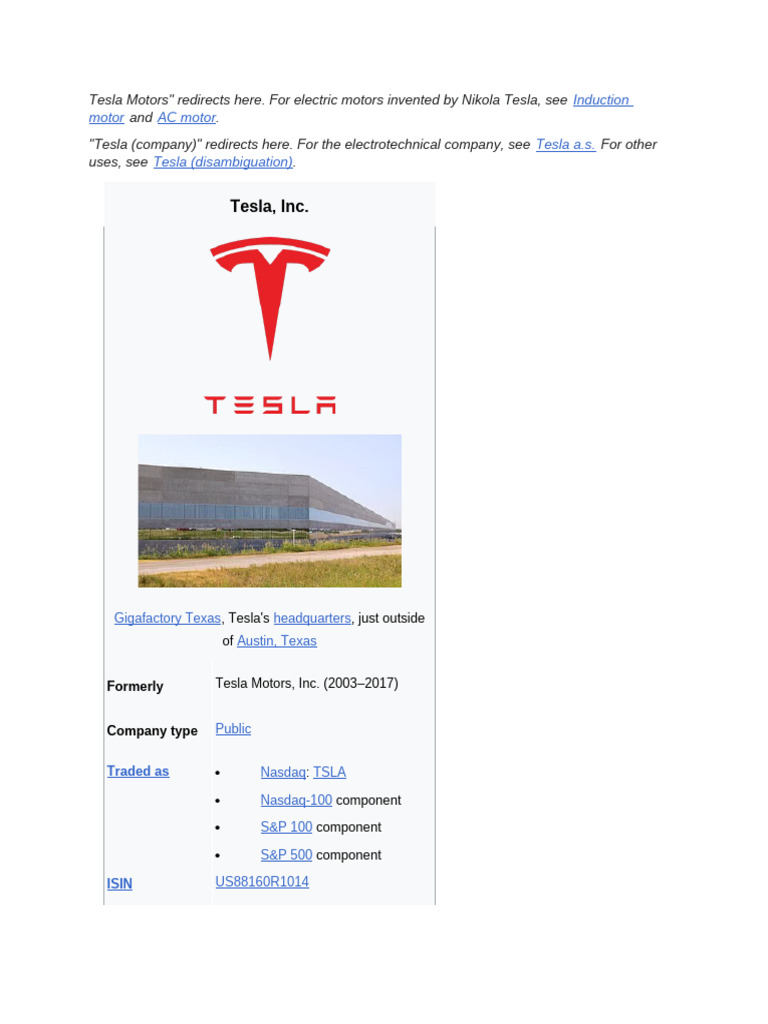 "Tesla (company)" redirects here. For the electrotechnical company, see Tesla a.s. For other