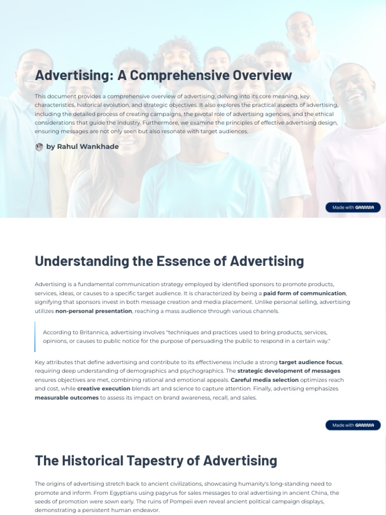 This document provides a comprehensive overview of advertising, delving into its core meaning, key